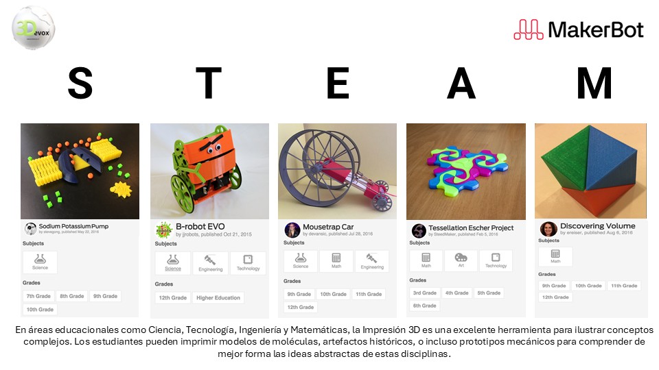La impresión 3D, enfocada y basada en plataformas de soporte educativo, orientadas a proyectos de creación, diseño y ejecución, permiten incorporar el desarrollo de habilidades para los alumnos, con enfoques bien específicos en las áreas de ciencia (S), tecnología (T), ingeniería (E), arte (A) y matemáticas (M) de una manera integral, a través de proyectos de Impresión 3D que son ejecutados durante varias sesiones, en distintas asignaturas de un mismo currículo.