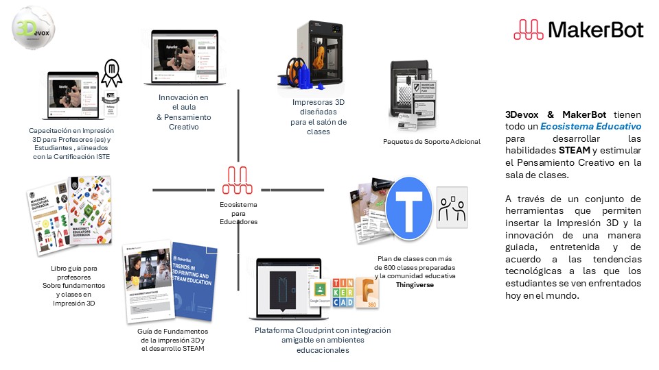 Esta tecnología es aplicable en varias áreas del conocimiento; desde el diseño y modelamiento de una célula en biología, el estudio de la anatomía de los seres vivos y el diseño de esqueletos y musculatura, hasta la creación de modelos funcionales de engranajes, motores y estructuras constructivas, la ejecución de un proyecto 3D es una excelente oportunidad para motivar y dar herramientas del mundo actual y futuro a los alumnos en los niveles del pensamiento crítico.Las metodologías de MakerBot se basan en un ecosistema que incluye: